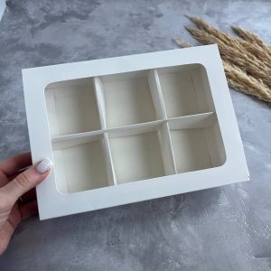 Картонна коробка з прозорим вікном під еклери, торти, мусові тістечка та тістечка-ескімо. Містить вкладки — ложементи (6 шт. — 137 мм * 48 мм), завдяки яким тістечка надійно фіксуються в коробці, не змінюючись під час транспортування, а також легко витягуються з неї.