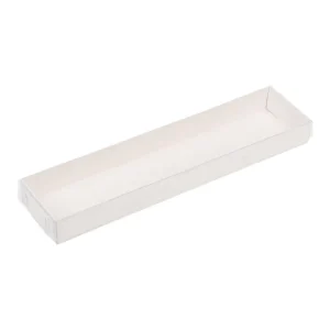 Картонна коробка з прозорим вікном під еклери, торти, мусові тістечка та тістечка-ескімо. Містить вкладки — ложементи (6 шт. — 137 мм * 48 мм), завдяки яким тістечка надійно фіксуються в коробці, не змінюючись під час транспортування, а також легко витягуються з неї.