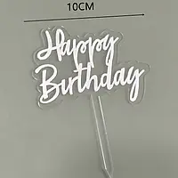 Топер Happy birthday на ніжці прозорий (білий напис)